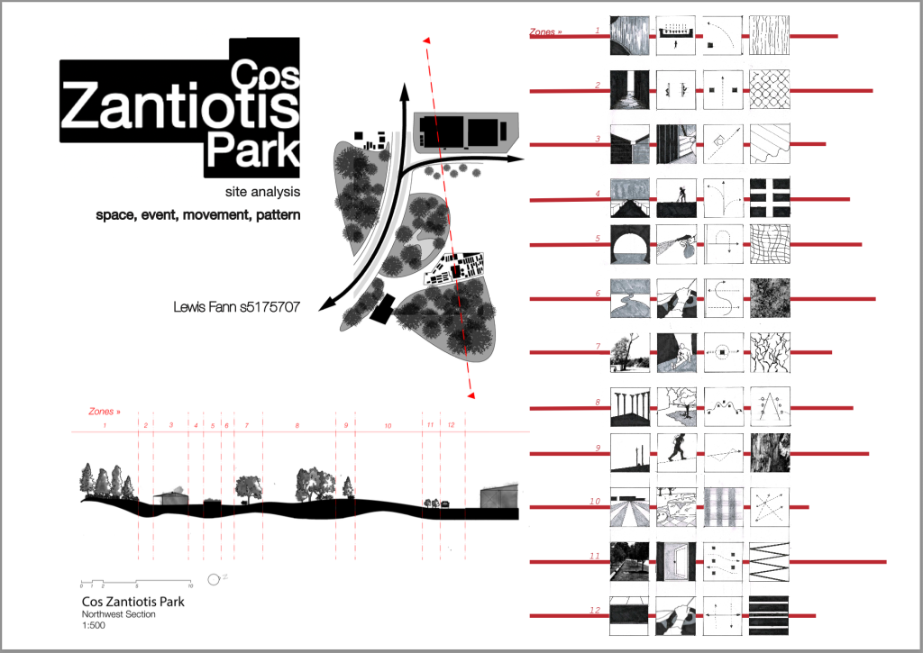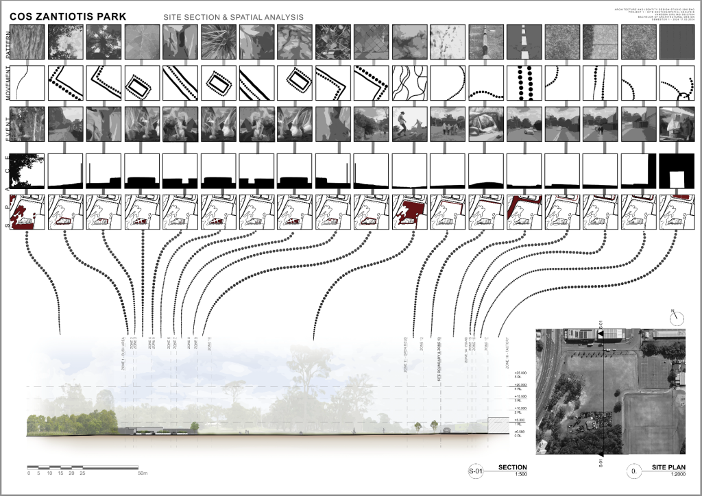 - 01 | Site Selection/ Spatial Analysis (week 1-3) – Study of the landscape (hard and soft) and urban environment through the diagrammatic and sectional representation of 4 elements: space, event, movement and pattern.