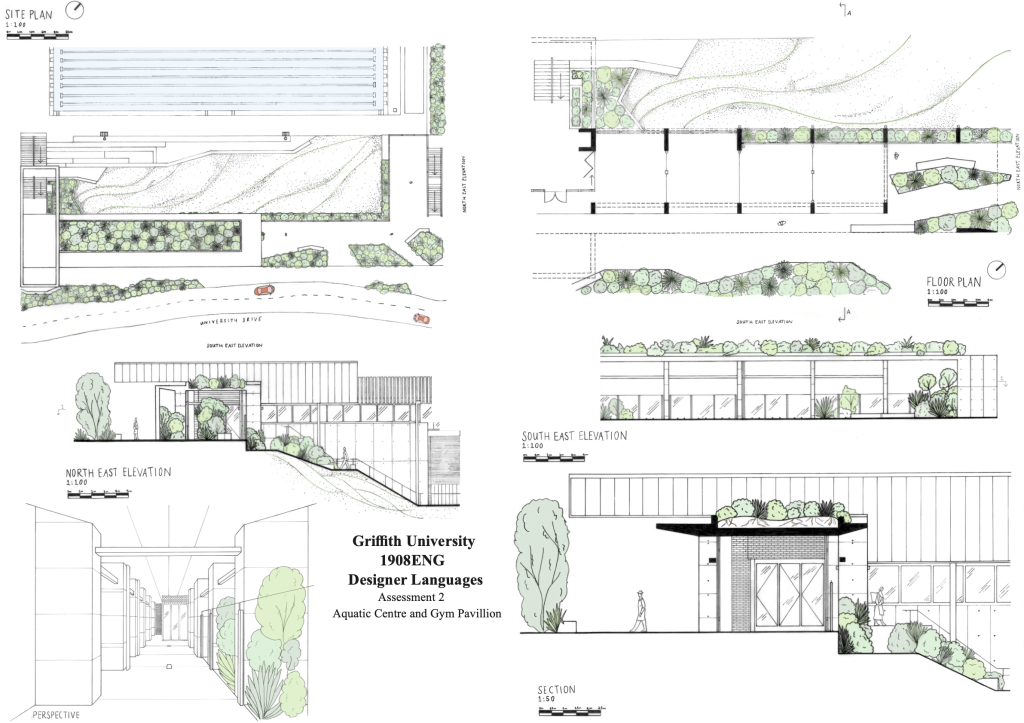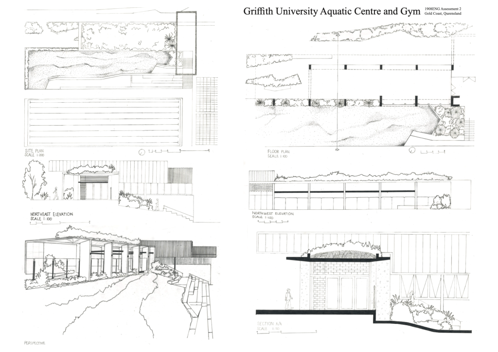 - 01 | Existing Conditions Scale Drawing (week 1-5, 35%) – Measure up an existing pavilion and associated site context on the university campus. Dimensioned sketches are provided to assist with the process to create a series of plans, sections, elevations and perspectives. these drawings form the basis for assessment 2 in 1901ENG: Design Studio 1 | Bodies In Space.